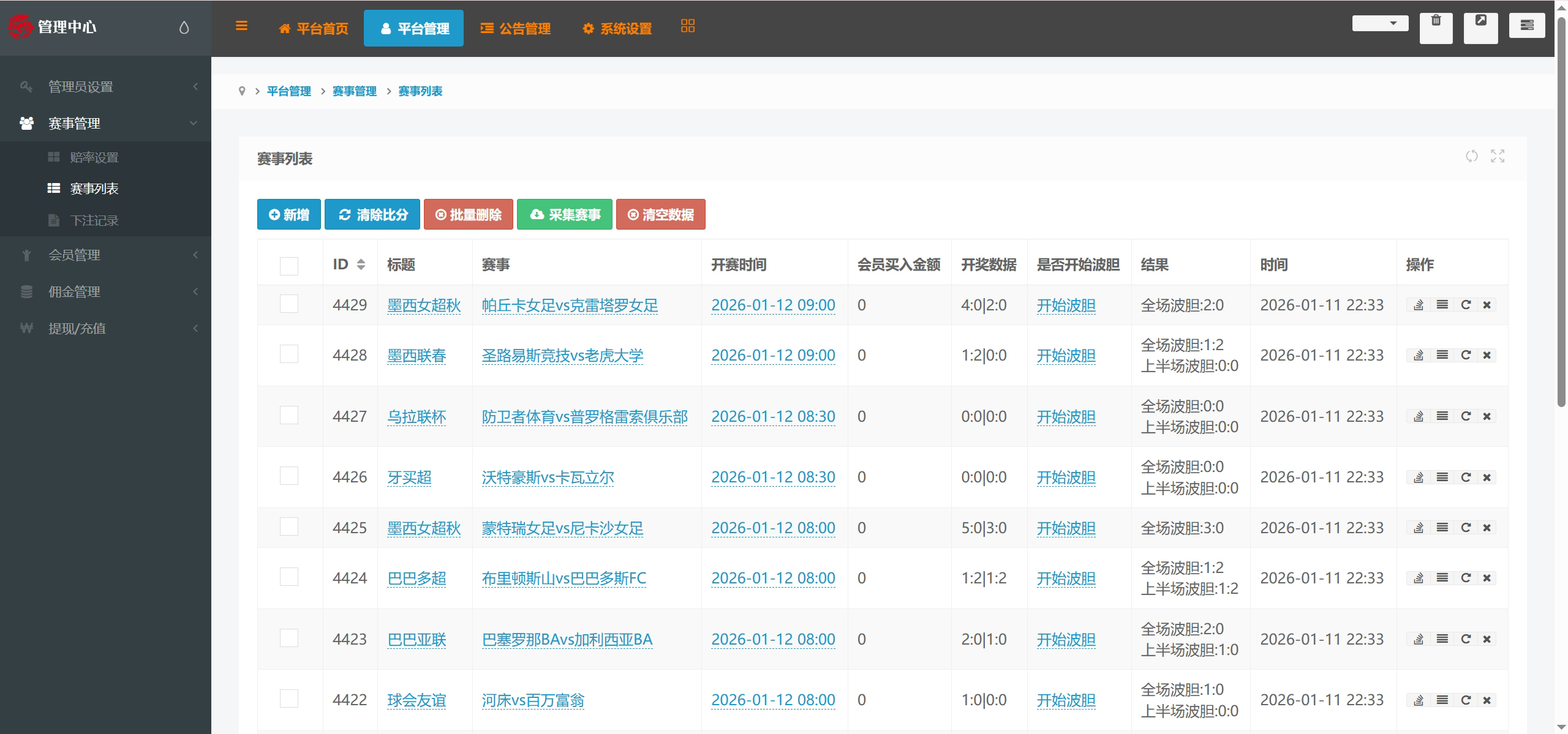 赛事采集要在后台赛事管理-赛事列表手动点击赛事采集按钮,也可以做成每天自动采集的方法