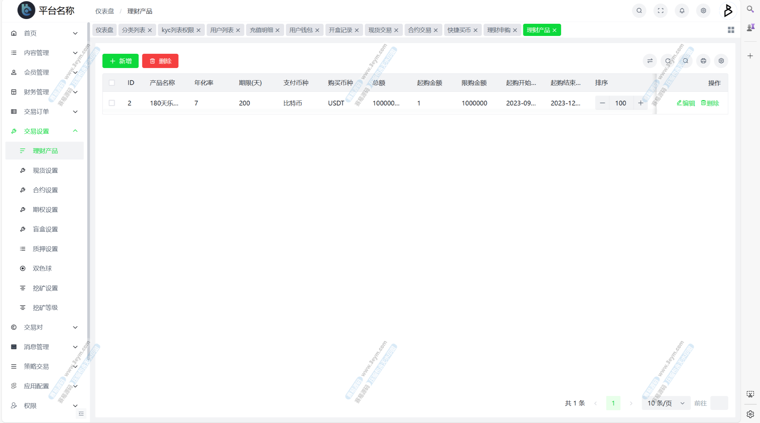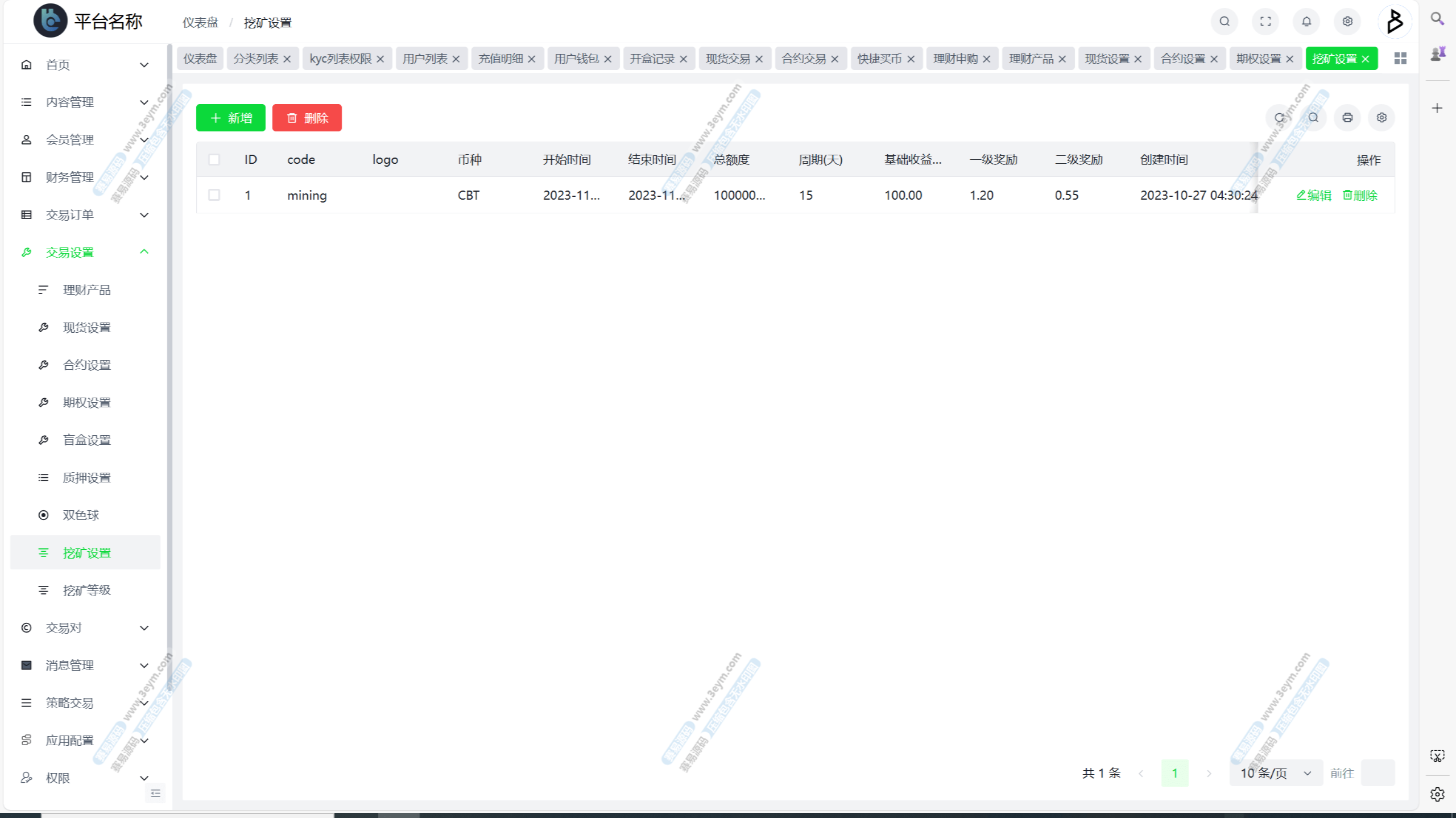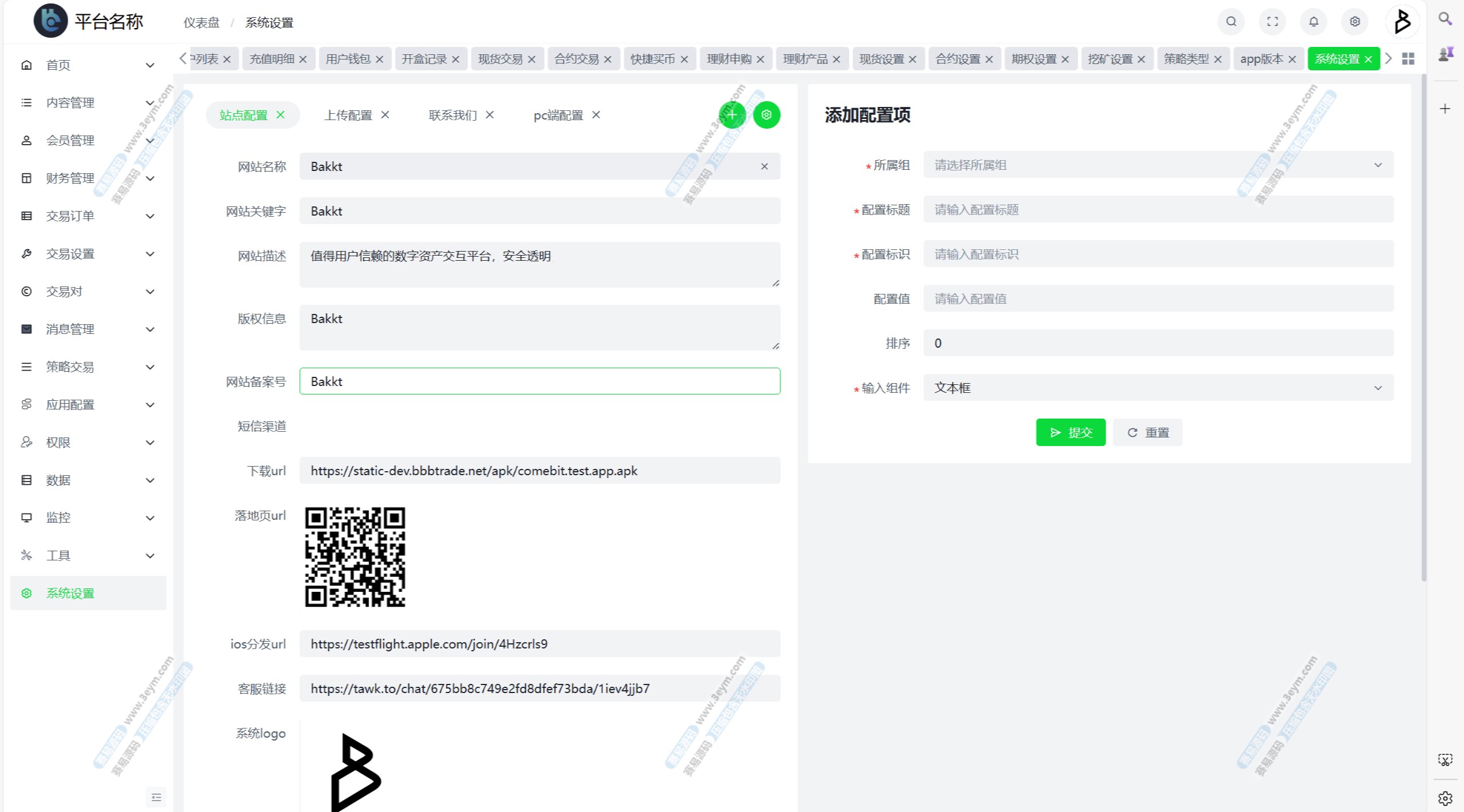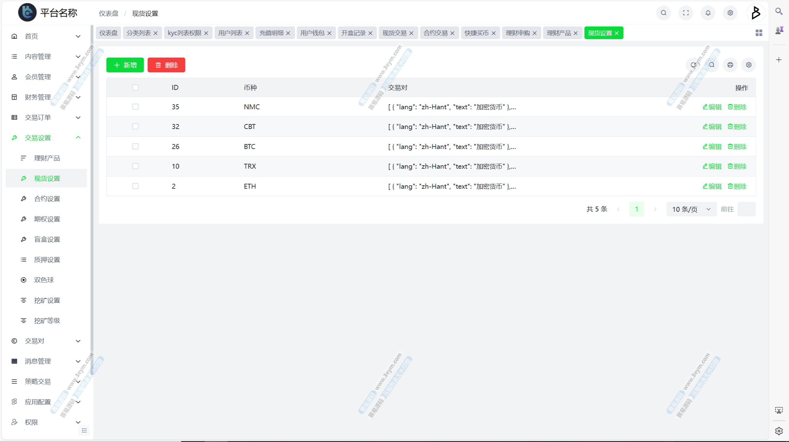 自定义币种,手续费,交易精度,交易类型(衍生品交易,币币交易,期权),是否可充值等。行情数据对接头部交易所币种行情接口。