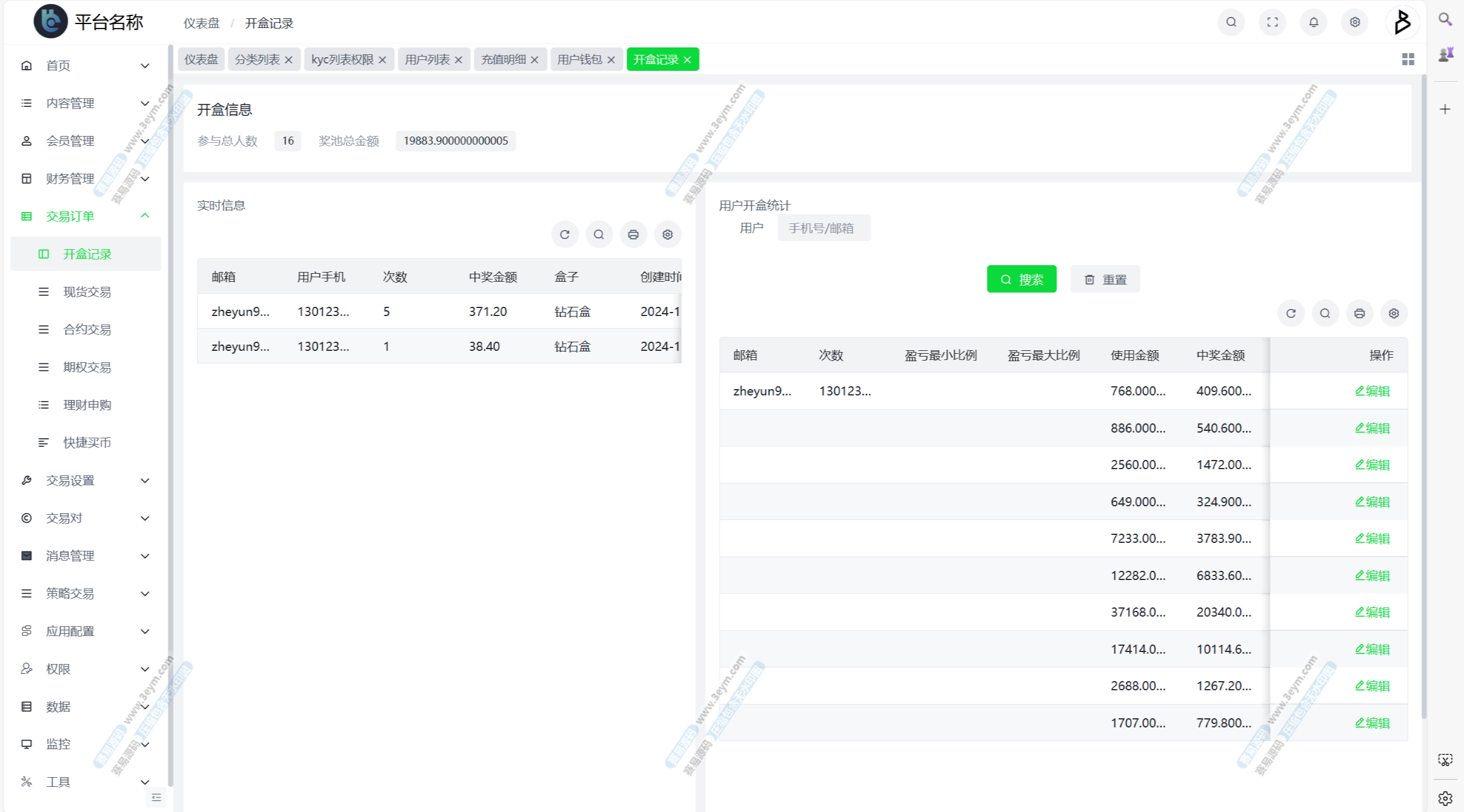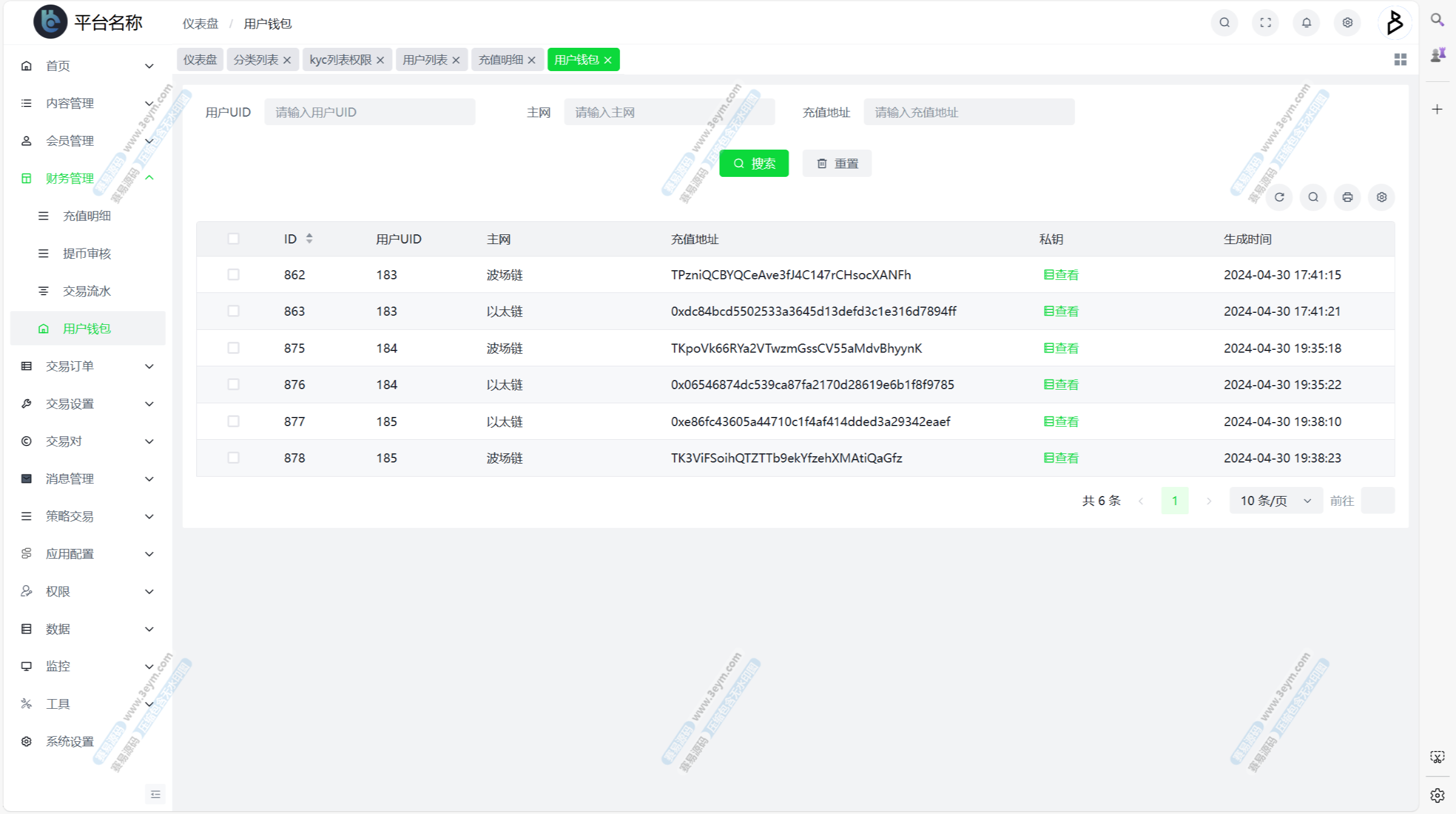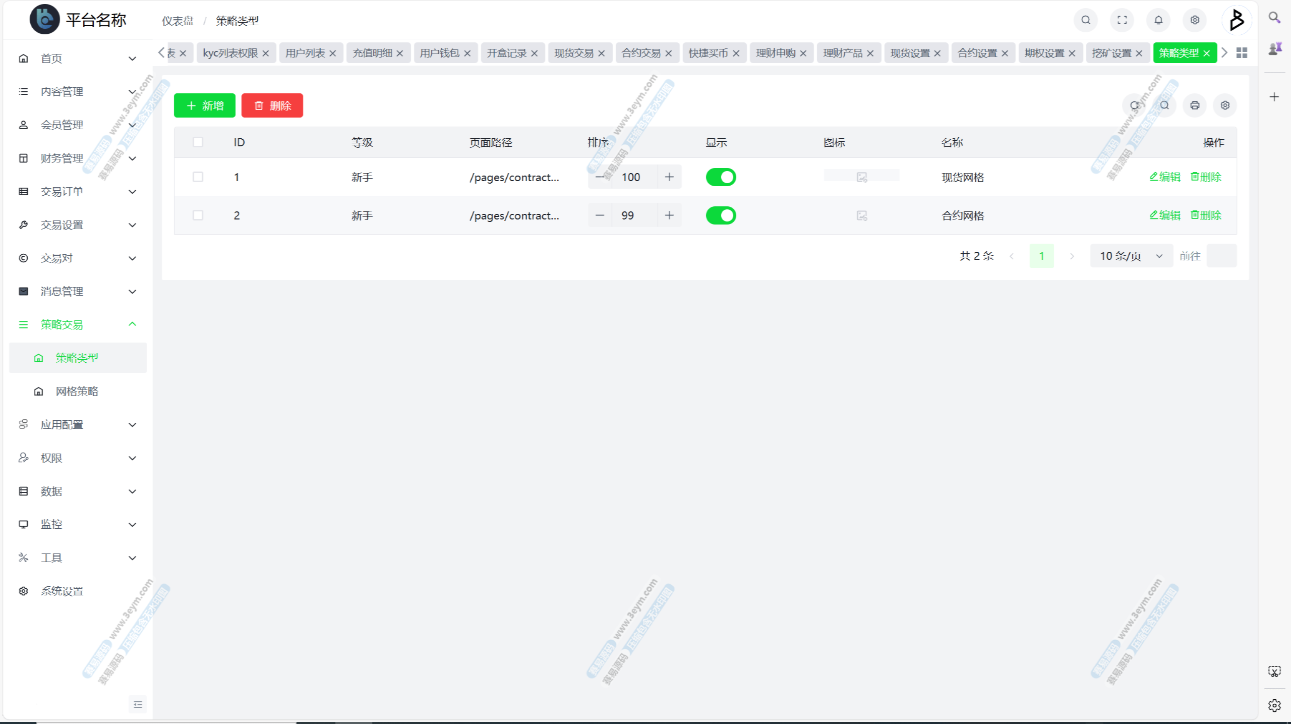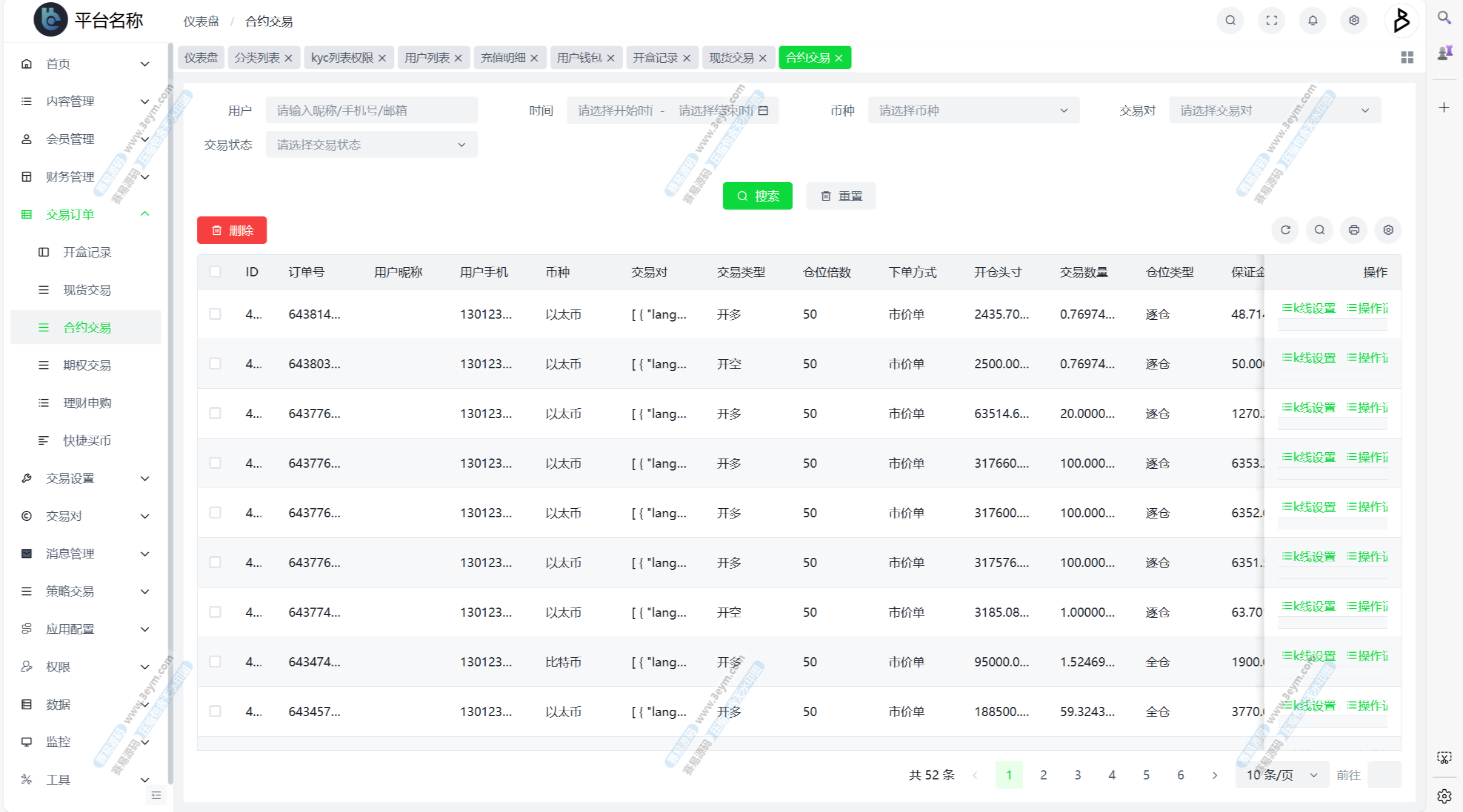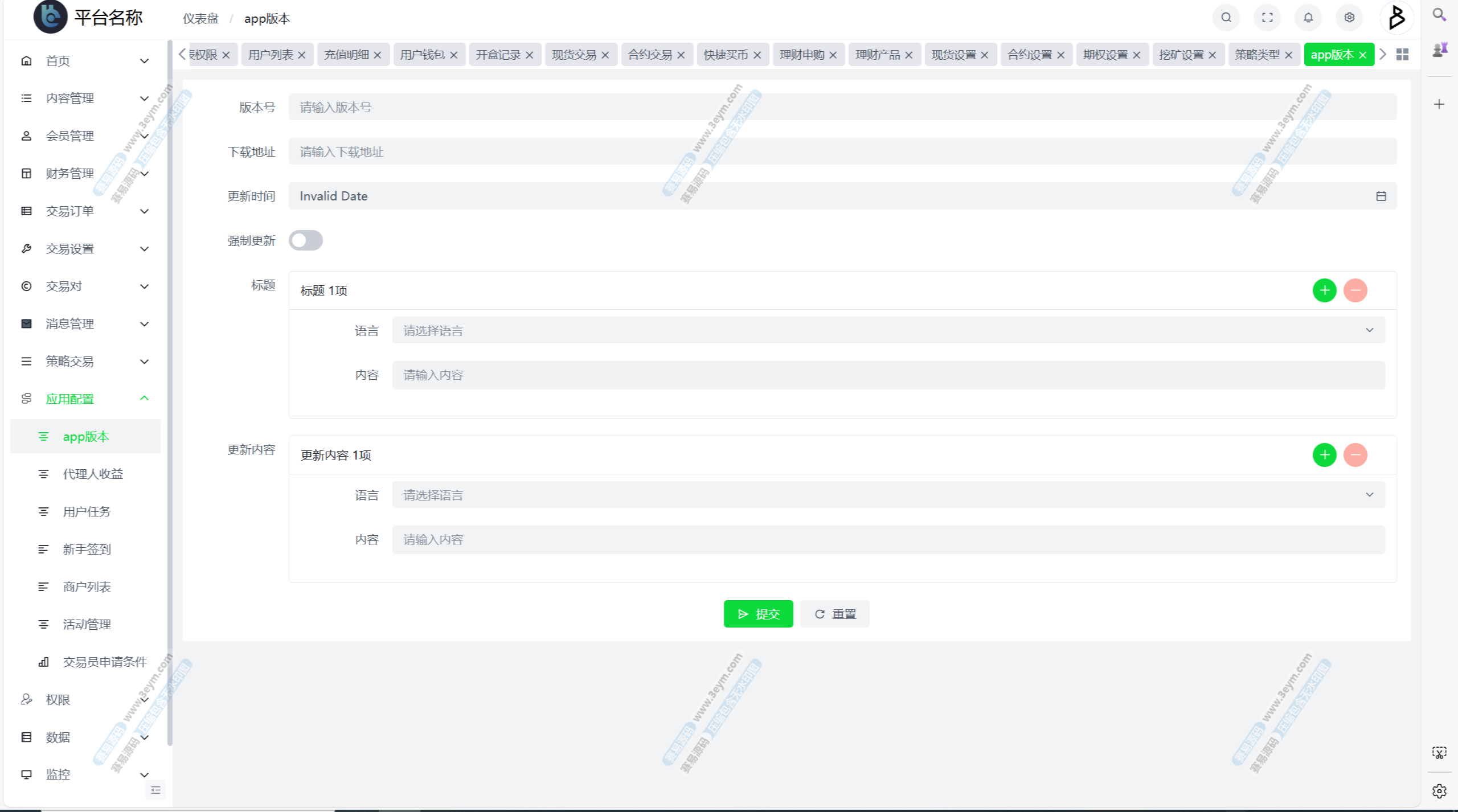 自定义币种,手续费,交易精度,交易类型(衍生品交易,币币交易,期权),是否可充值等。行情数据对接头部交易所币种行情接口。