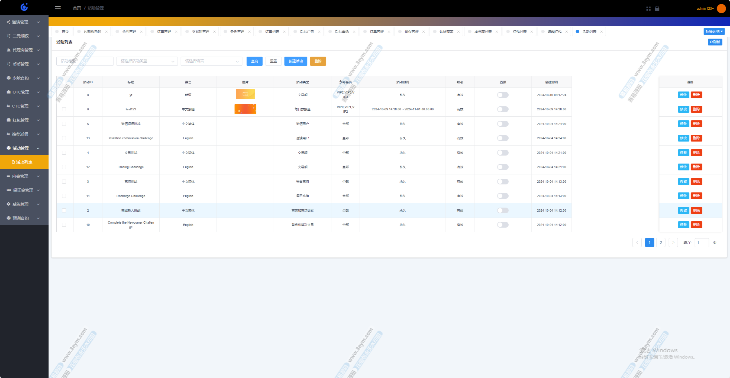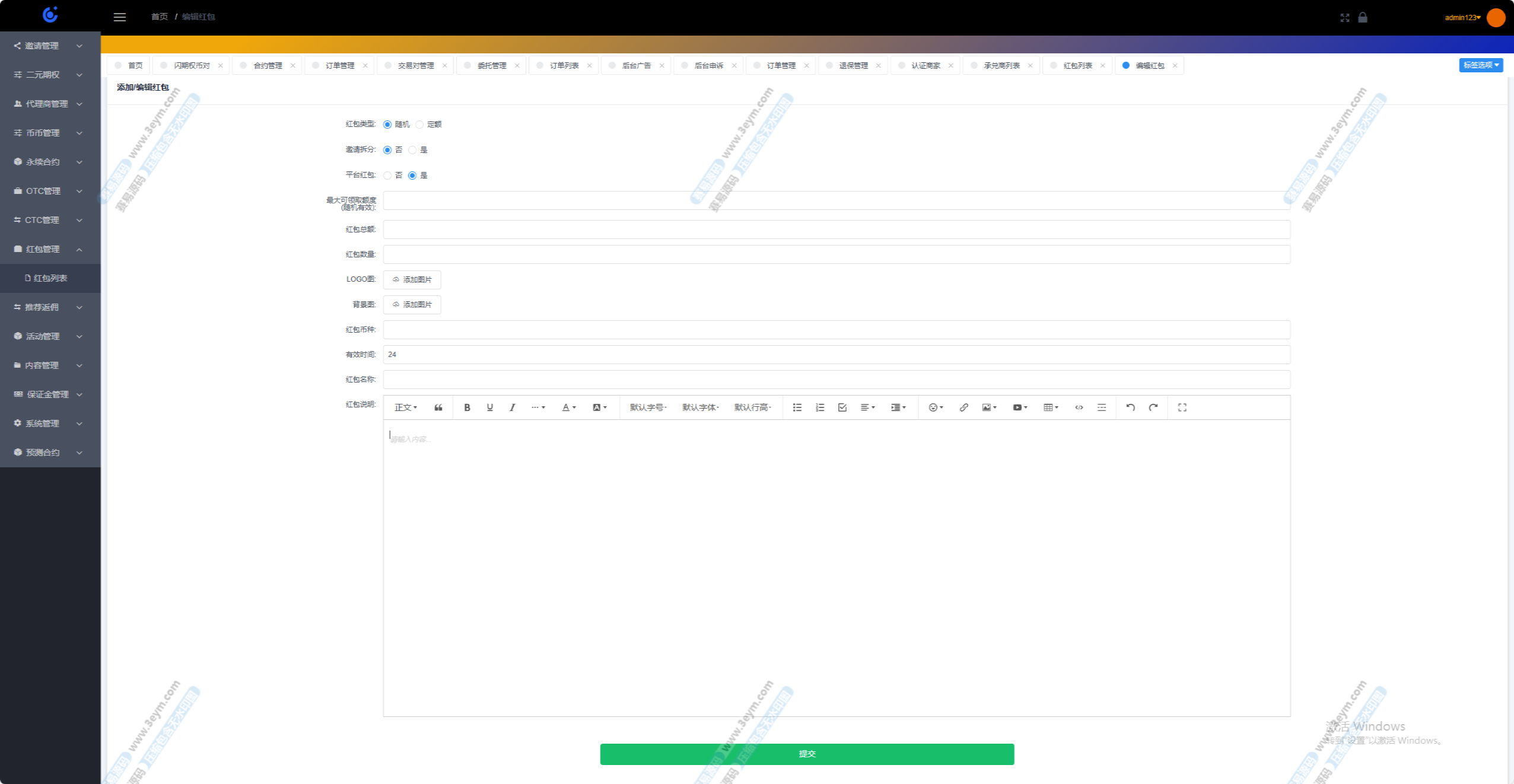 系统通过SaaS(软件即服务)模式为代理商提供独立运营的能力。每个代理商都可以拥有独立的域名、平台Logo以及个性化的交易所功能。代理商可以自行注册用户、管理交易所、创建营销活动、发布公告等,实现自主运营。- 代理商管理后台:代理商可以通过后台管理系统查看用户活动、交易数据和平台盈利情况,进行精细化的业务分析。