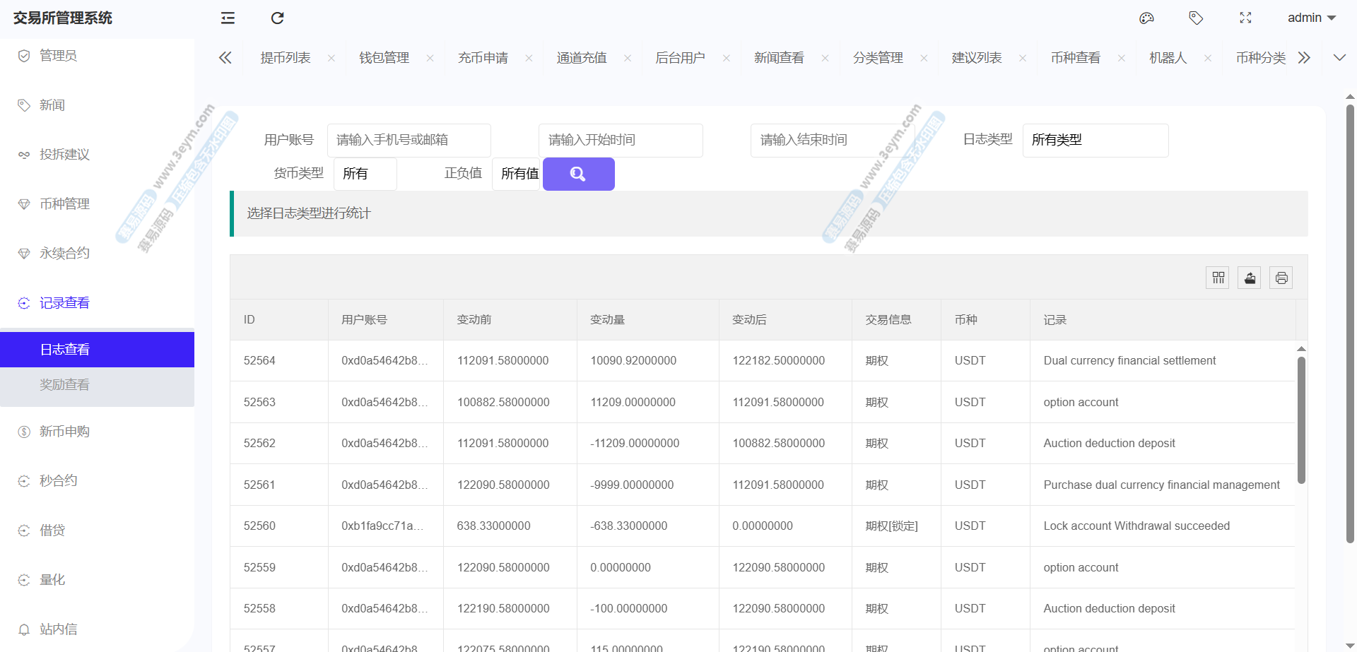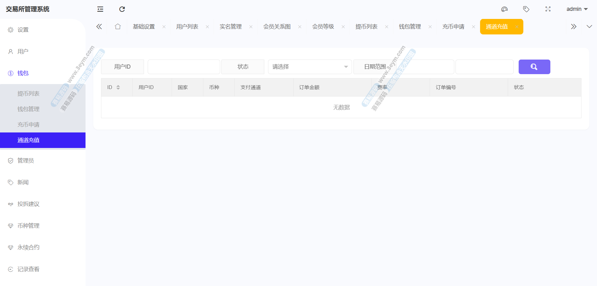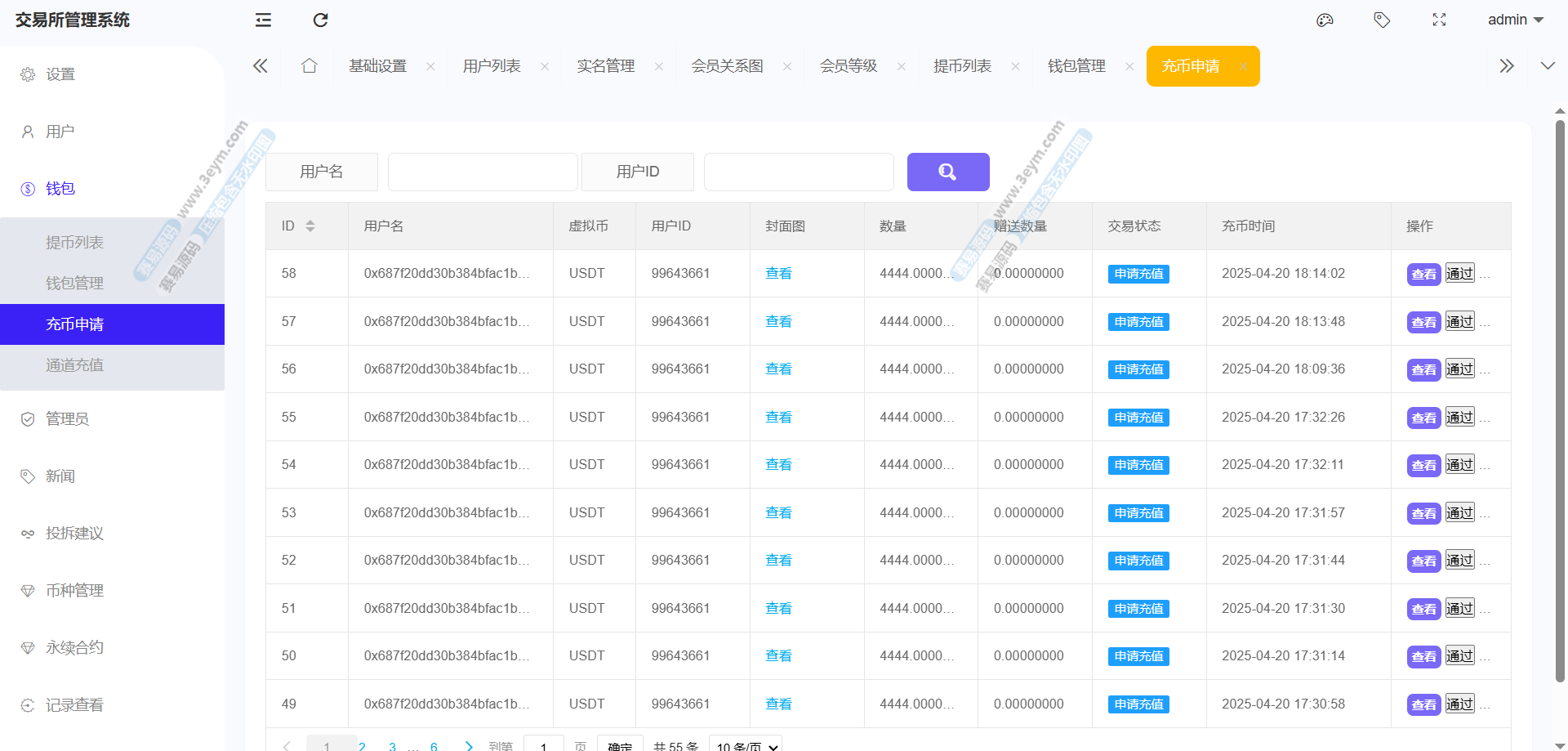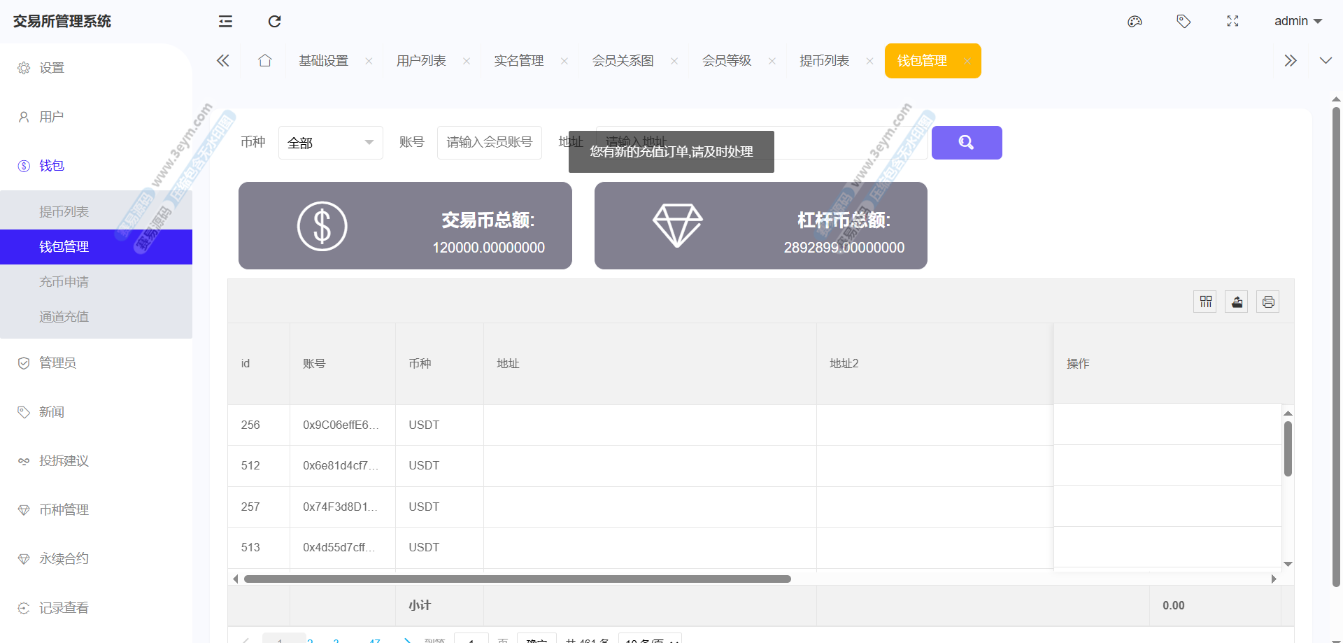 存款功能支持 USDT 存款,提供 ERC20 和 TRC20 两种链类型的选择,生成对应的存款二维码和钱包地址,方便用户进行资金充值。
