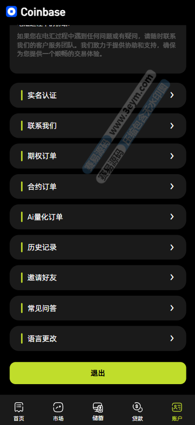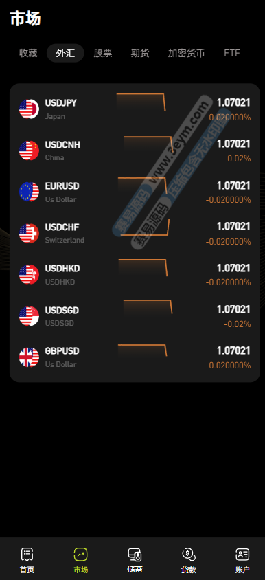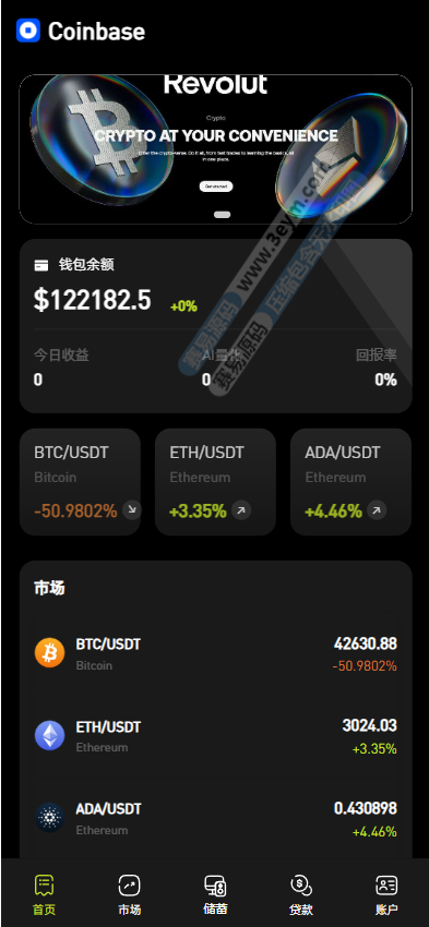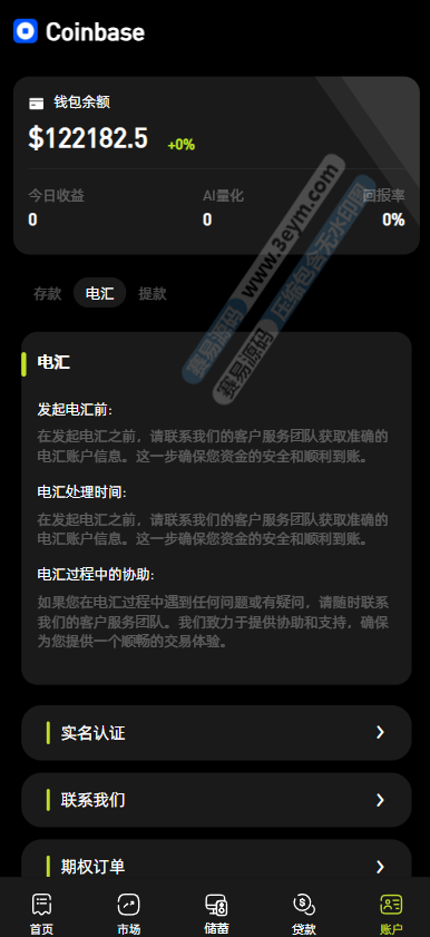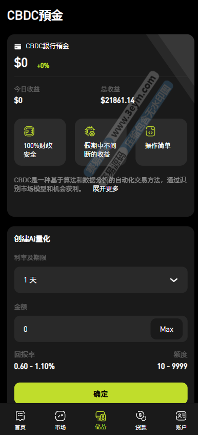 系统底部设有 “首页”“市场”“储蓄”“账户” 等导航栏,方便用户在不同功能板块间切换,如 “市场” 板块可查看各类金融产品行情,“储蓄” 板块涉及 AI 量化和 CBDC 预金,“账户” 板块管理钱包和资金操作。