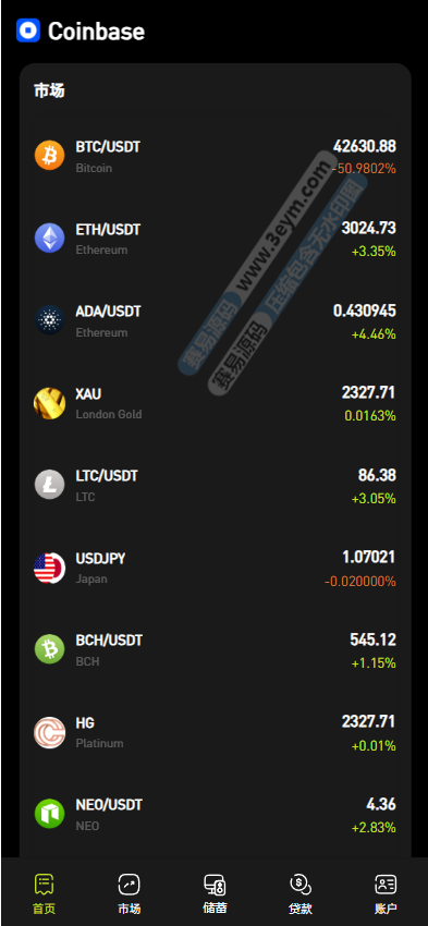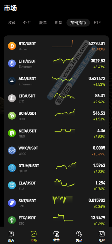 加密货币:支持(BTC)、(ETH)、ADA、LTC)等多种主流加密货币交易,可查看实时价格(如 BTC/USDT 价格波动)、涨跌幅度(绿色表示上涨、橙色表示下跌)及 K 线走势(如 BTC 的分时 K 线图,包含开盘、收盘价格,还可切换 1 分钟、5 分钟等不同时间周期)。