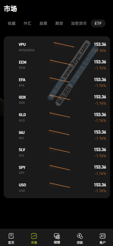 ETF:包含 VPU、EEM、EFA、GDX 等 ETF 产品,同样展示价格和涨跌情况(如 VPU 上涨 0.54%)。