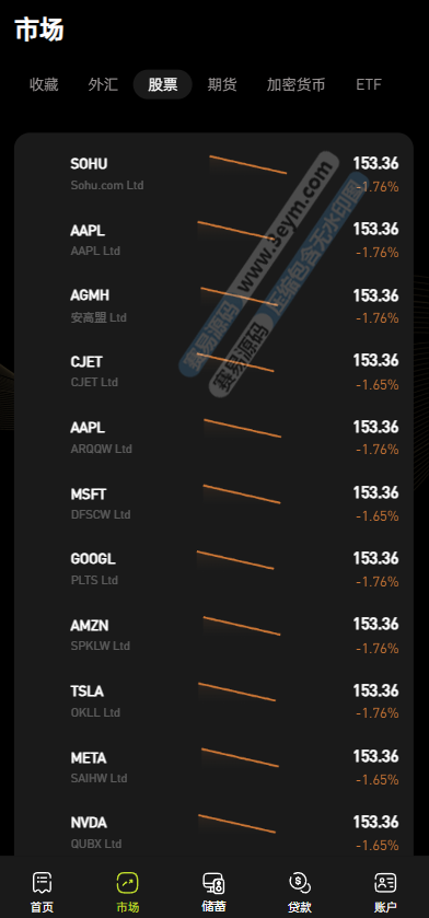 股票:涵盖搜狐(SOHU)、苹果(AAPL)、微软(MSFT)、谷歌(GOOGL)、亚马逊(AMZN)、Meta 等知名企业股票,显示股票代码、公司名称及涨跌幅(如 AAPL 上涨 3.20%)。