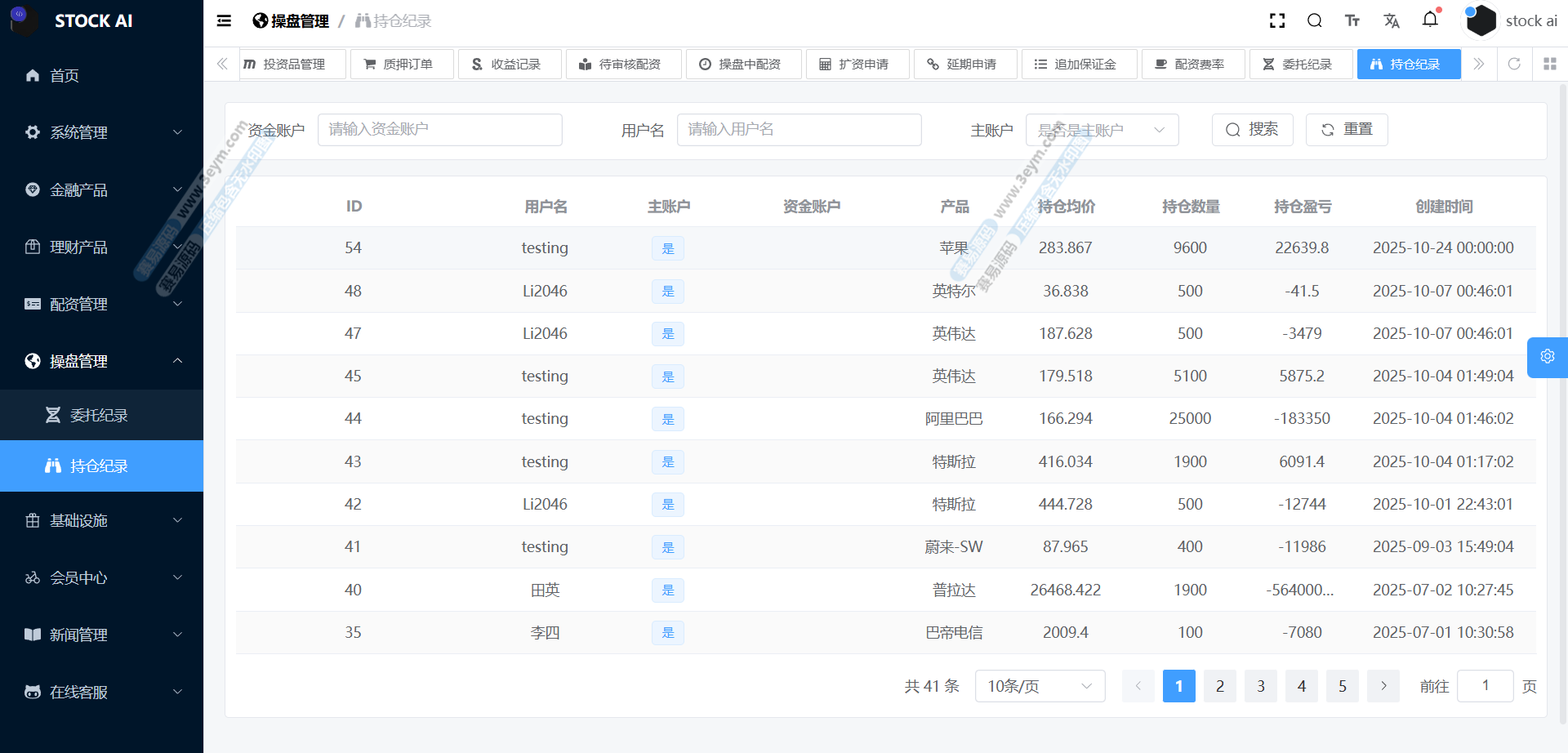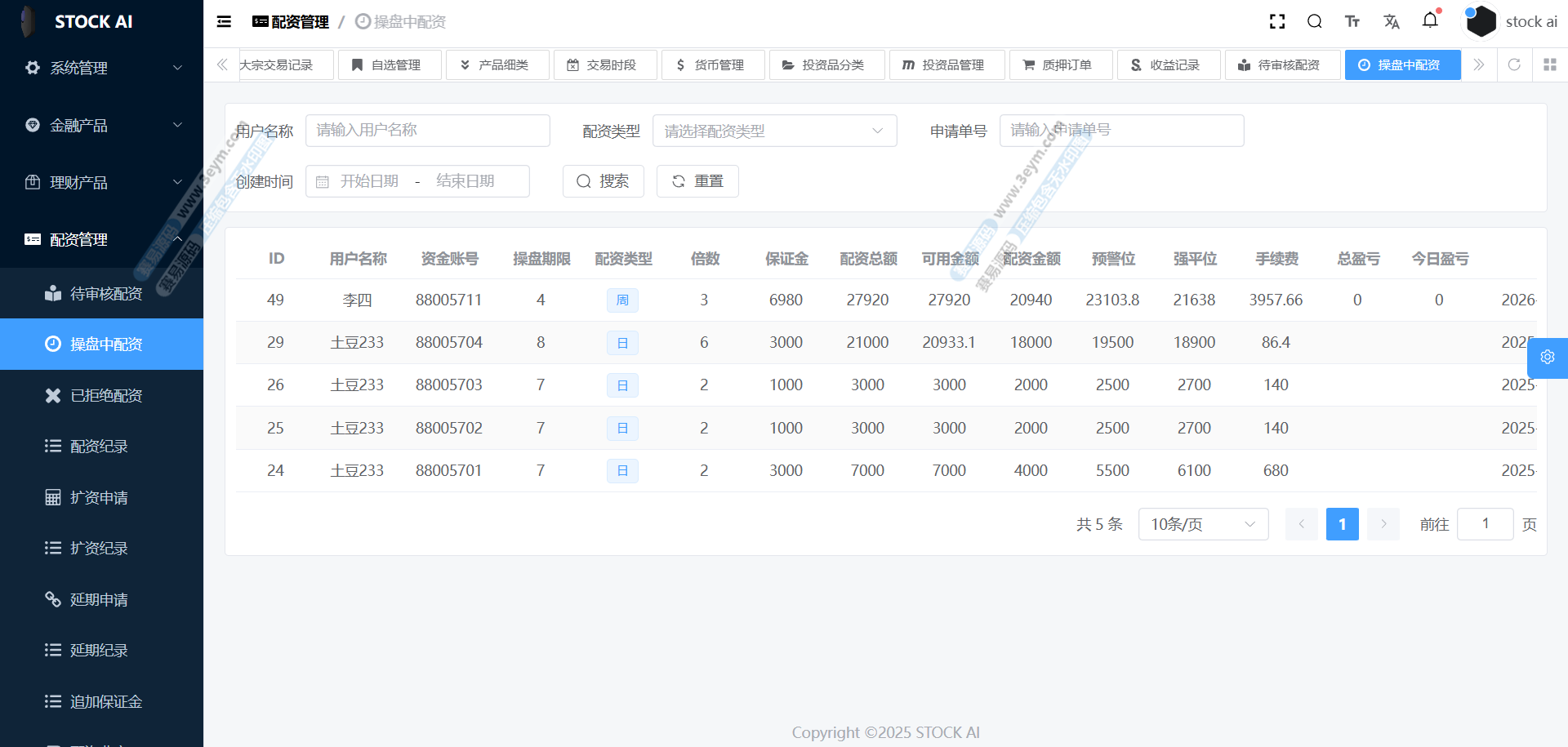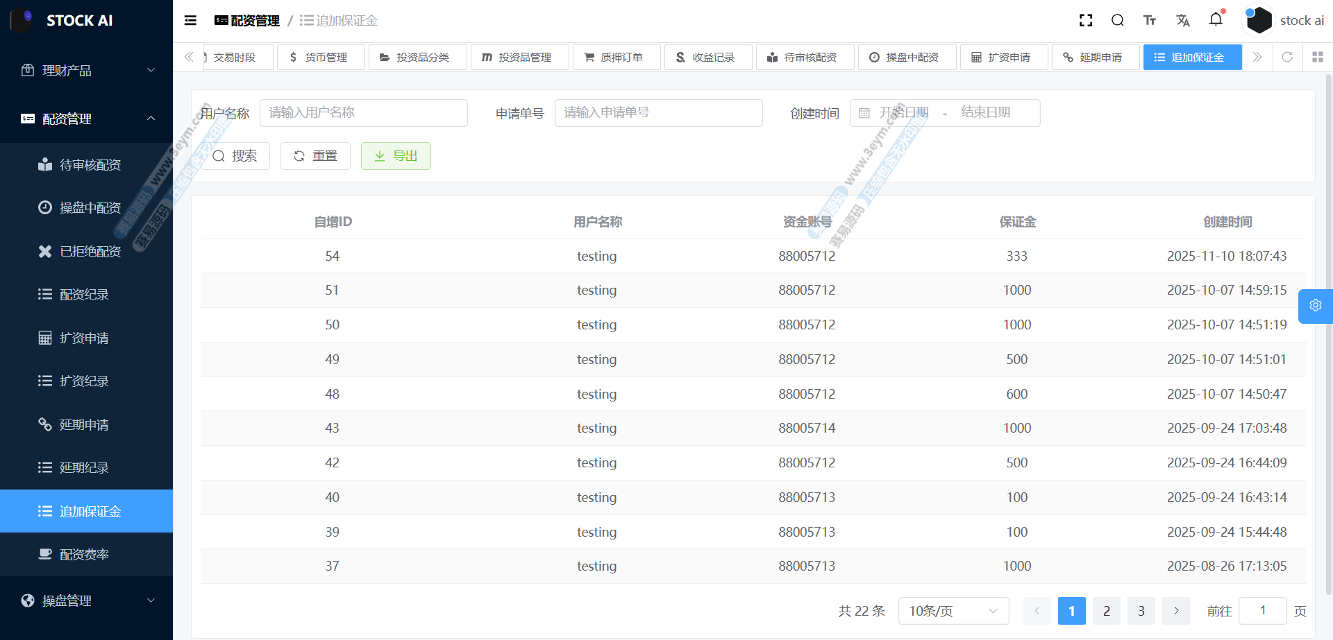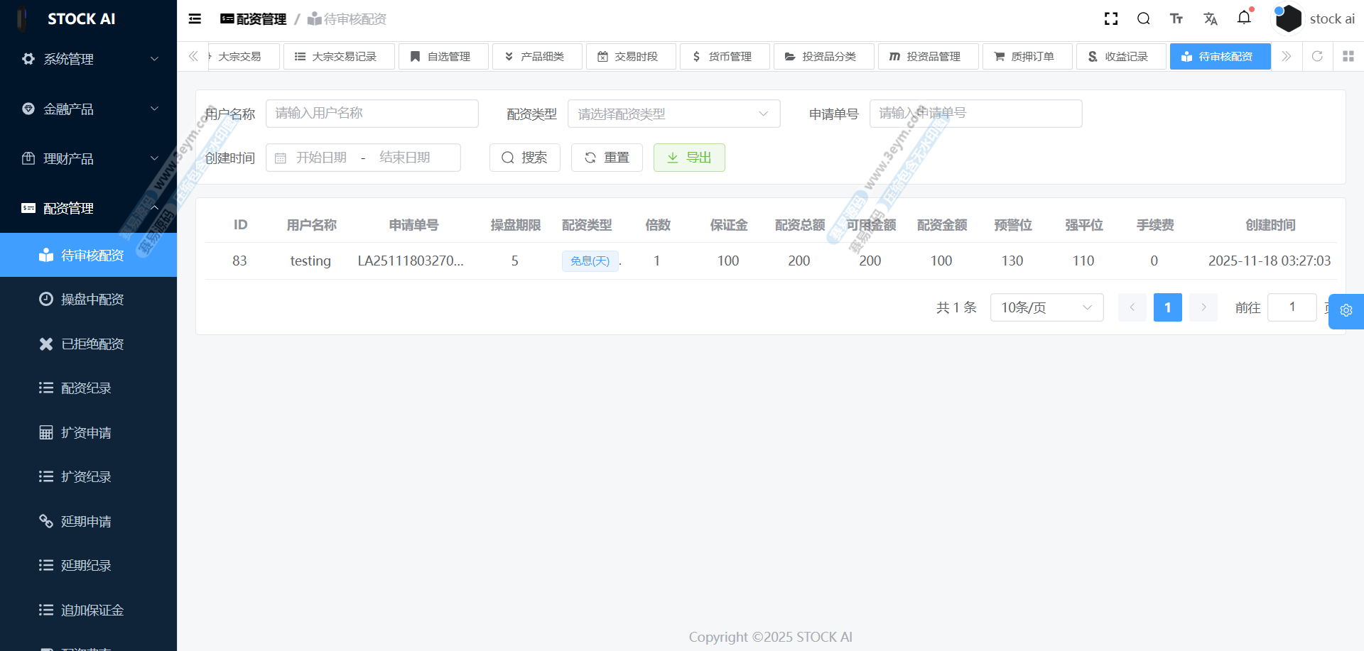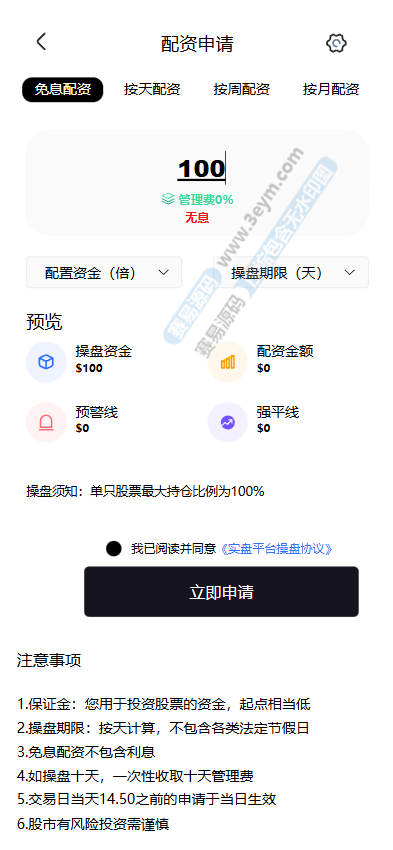 2、配资申请(根据用户自定义申请配资金额、倍数、周期)