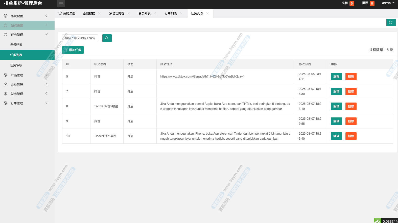 系统主打的是任务 + 接单撮合模式,前端展示任务大厅,用户根据规则接单,后台自动完成订单匹配和流程流转,整体逻辑清晰,适合做海外任务平台、众包系统、数字服务接单类项目。