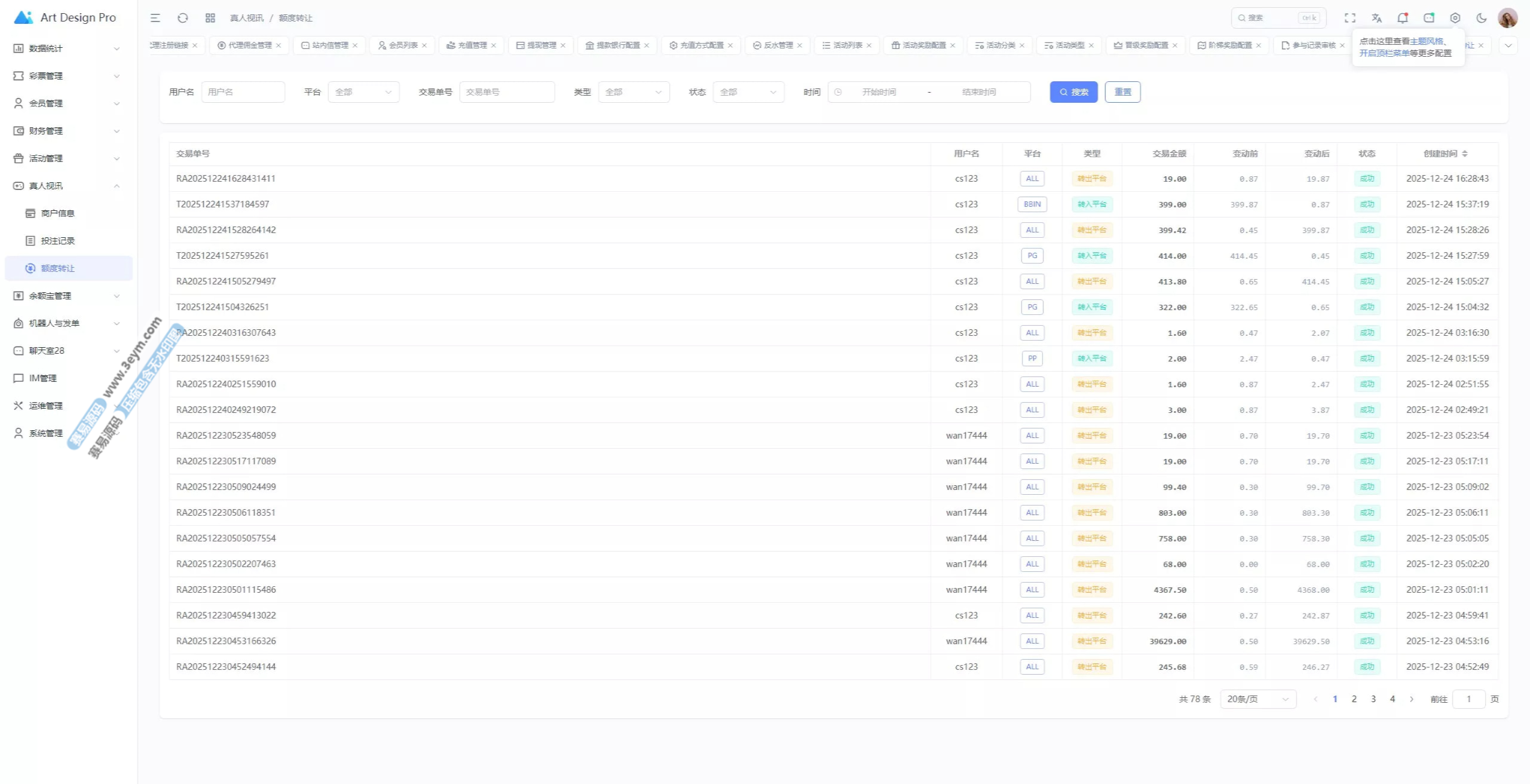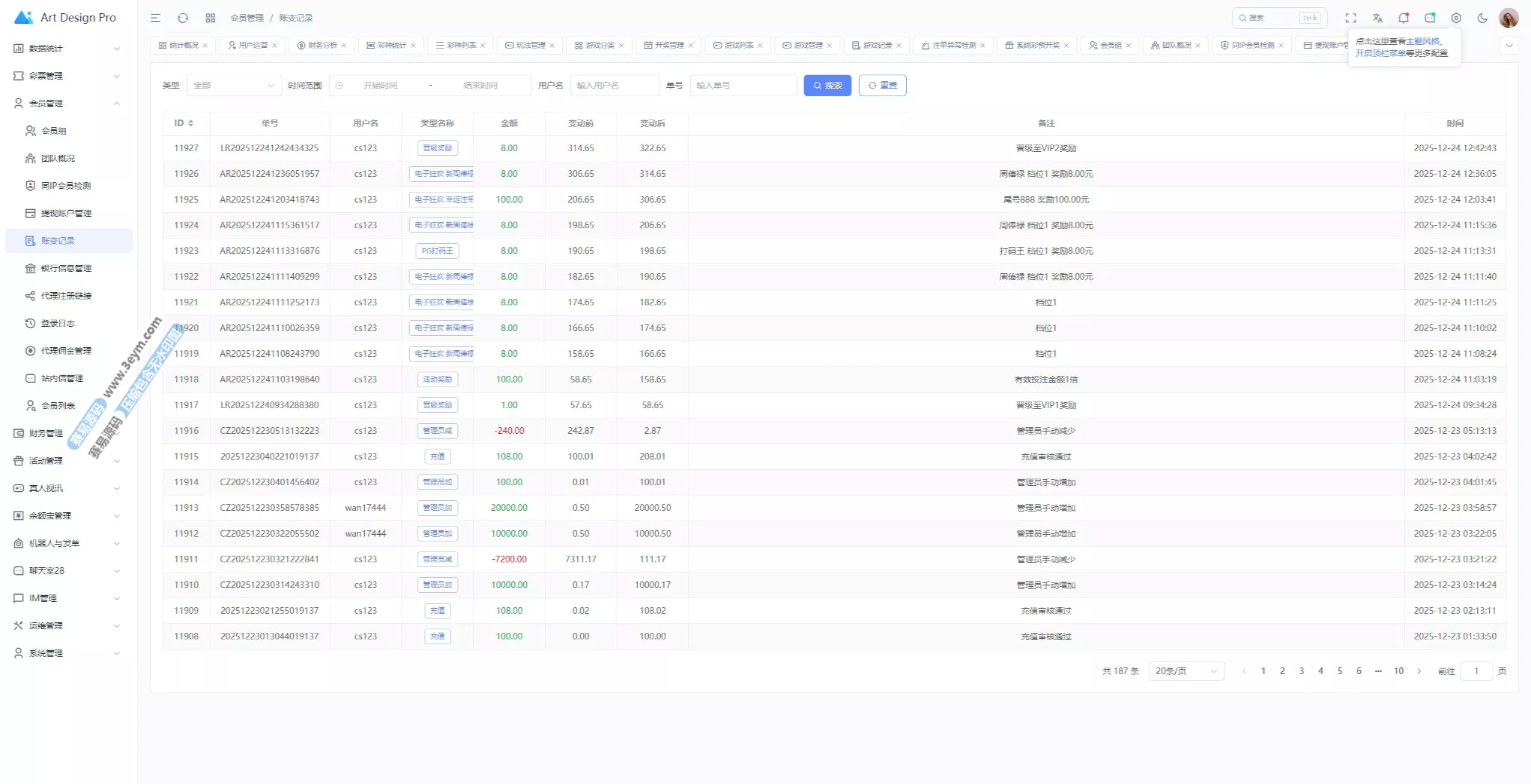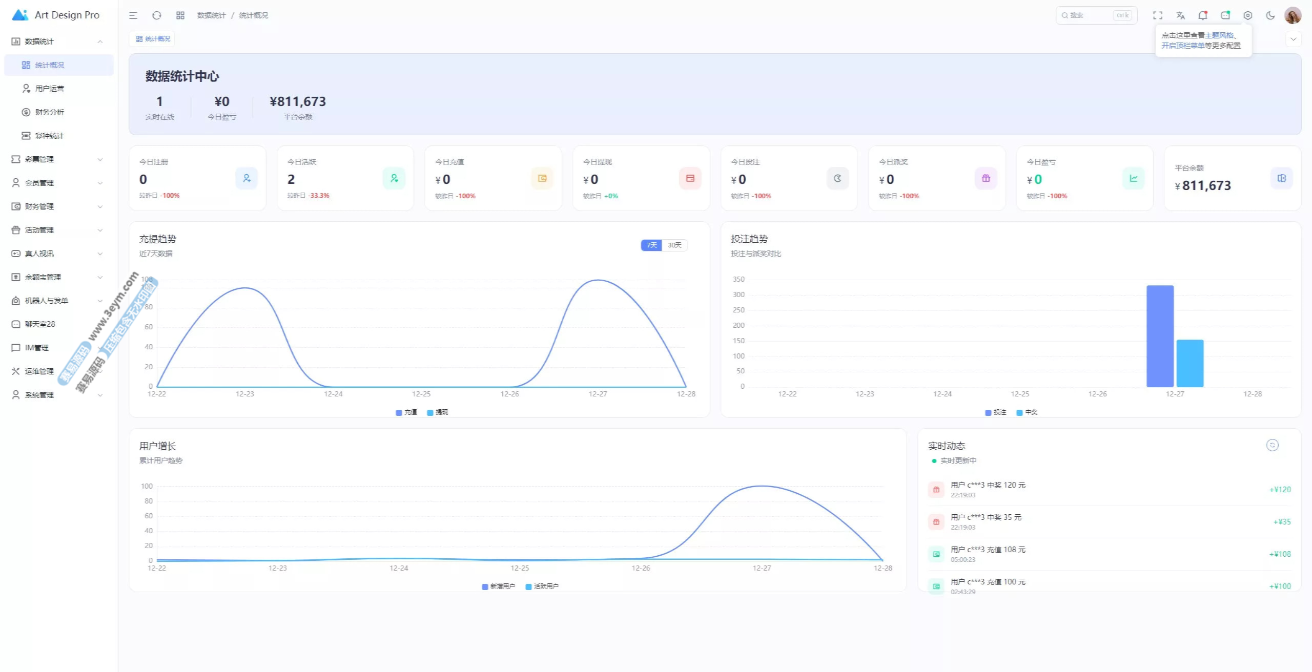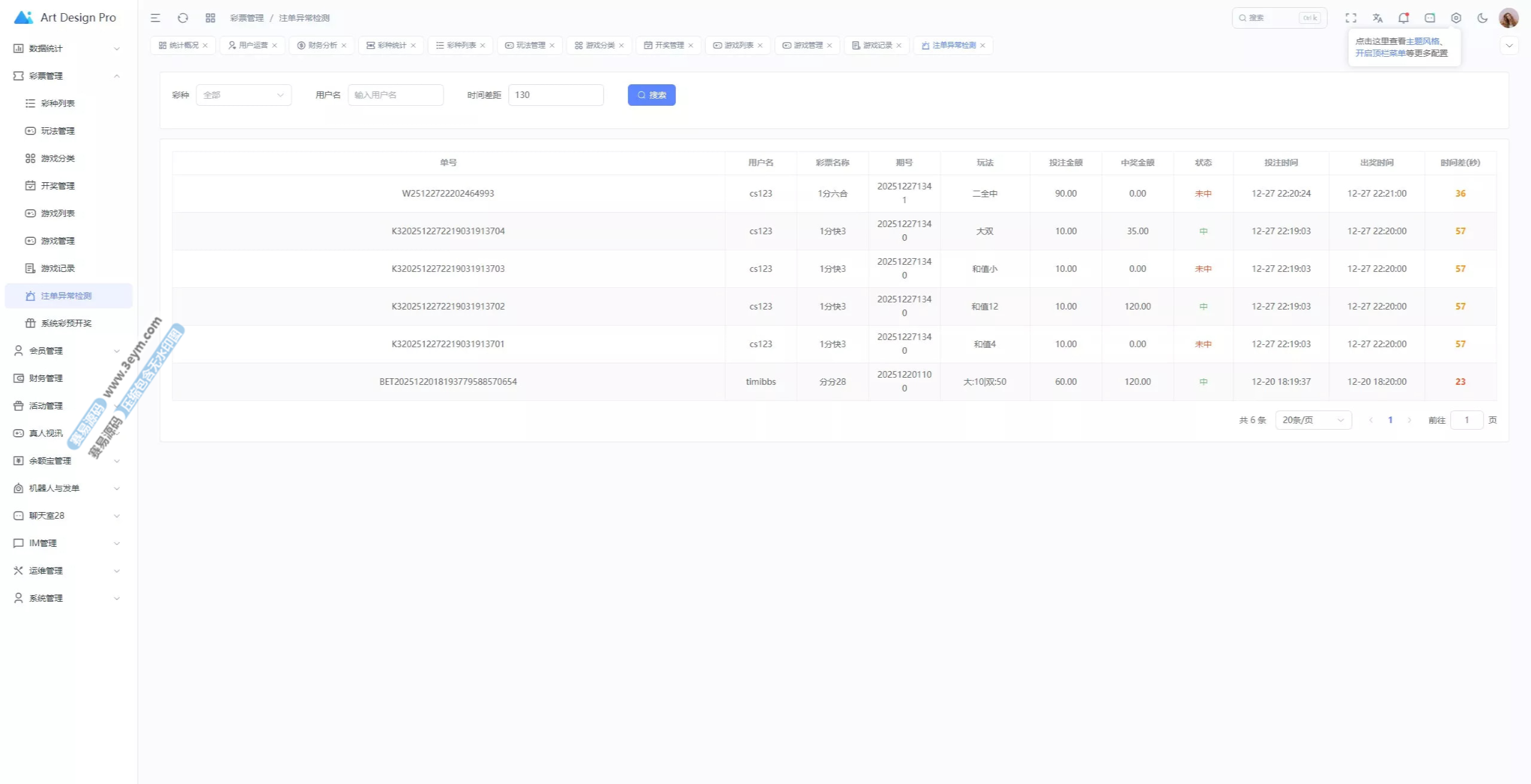 - 多彩种支持:体育盘、电子彩、真人、棋牌等
