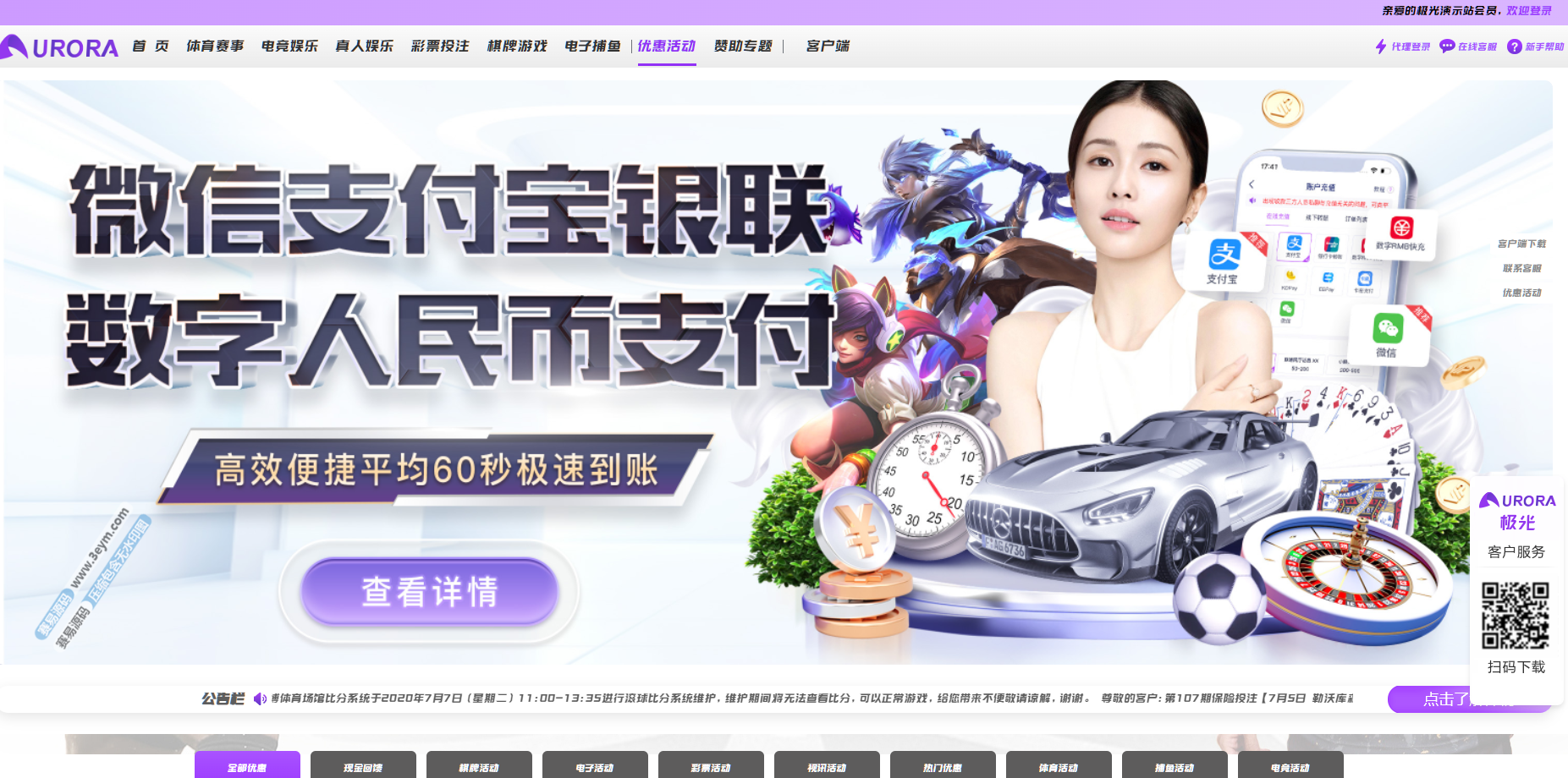 极光娱乐源码是一套基于欧宝娱乐二开UI的综合盘和包网系统源码。前端使用Vue编译版本,后端使用PHP完整开源程序,支持PC端和移动端的双端运营,界面进行了完全改版,功能稳定可靠,适合长期运营。