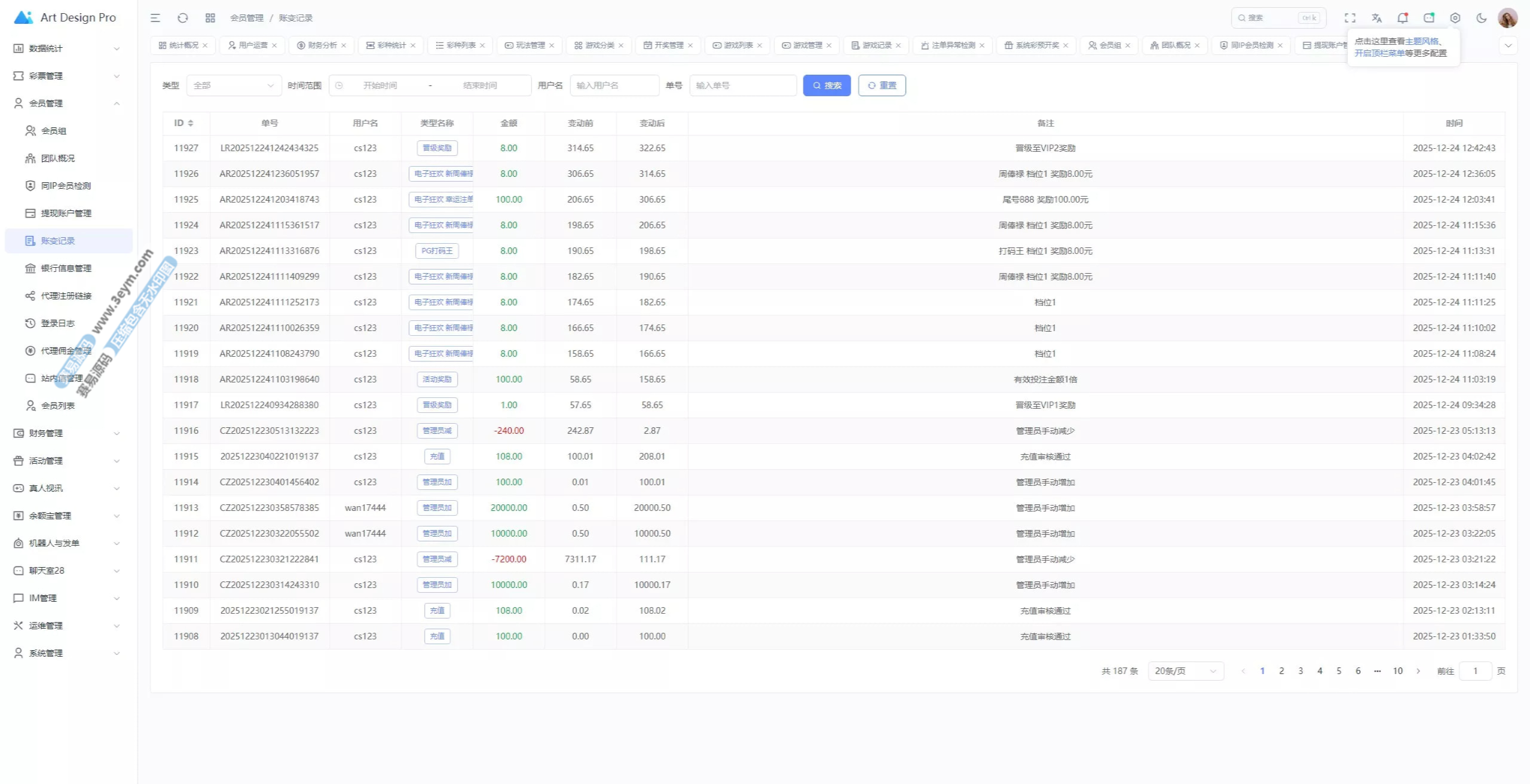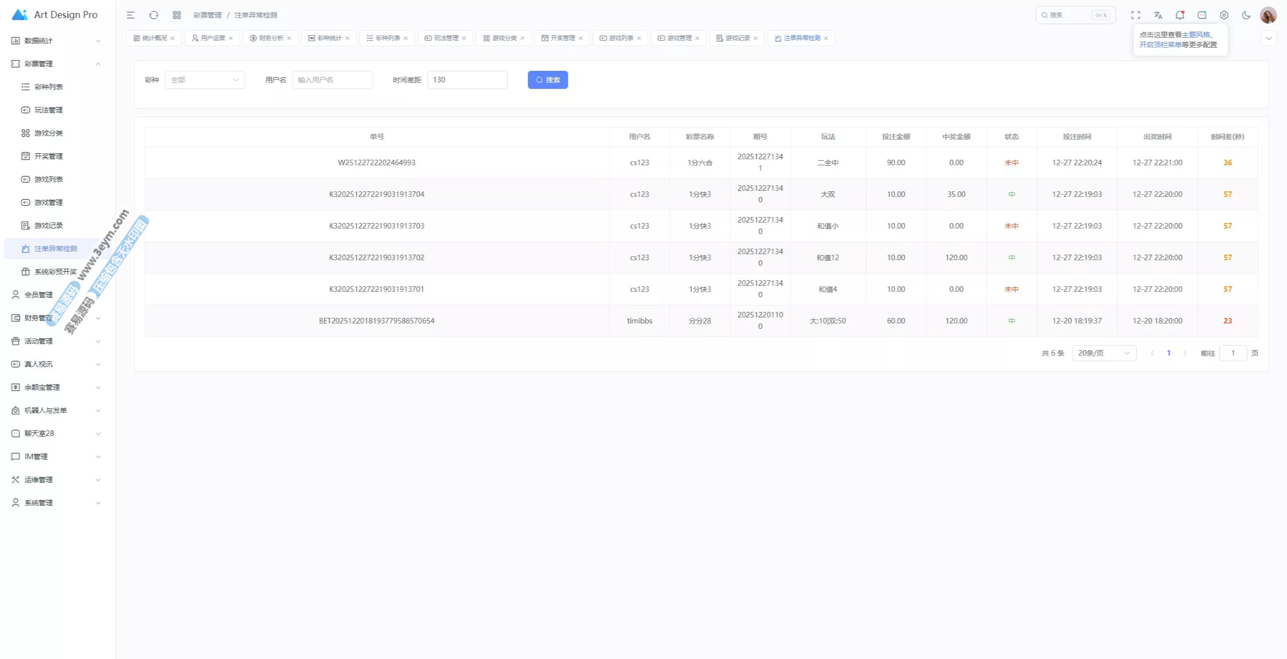 - 投注记录、财务流水统计