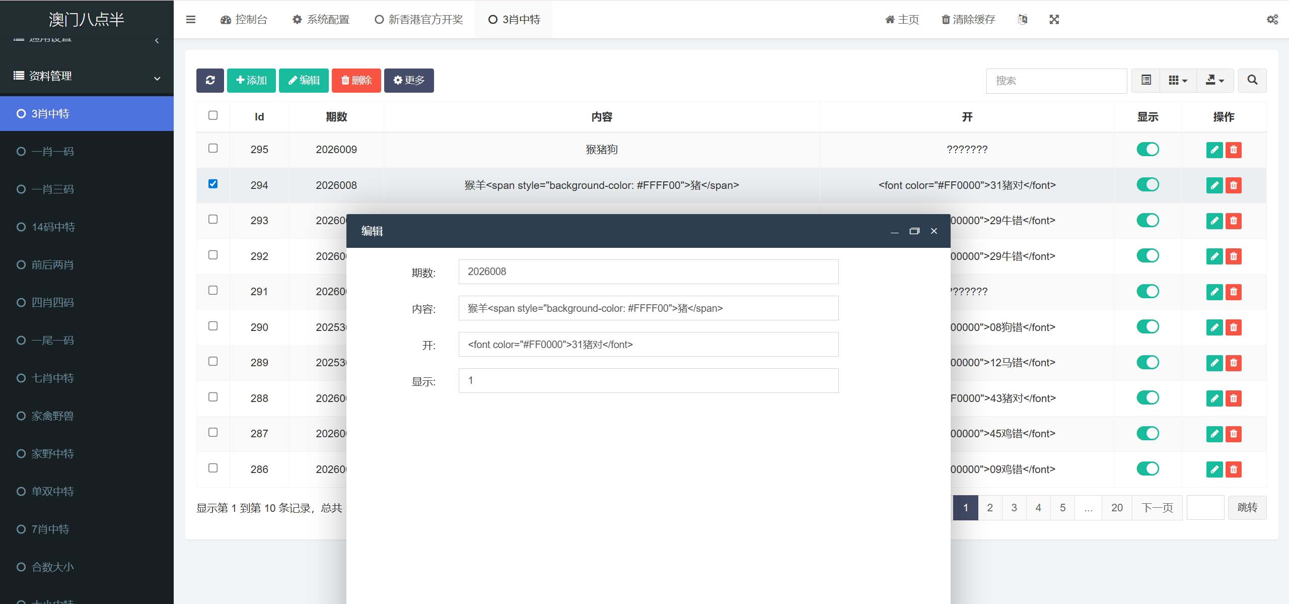 本套源码为一款功能完整的六合彩资料站系统,支持澳门八点半彩种资料展示、心水资料生成、开奖记录查询、自动开奖等功能。程序采用前后端分离结构开发,前端为HTML自适应页面,后端基于PHP FastAdmin框架,整体代码开源,结构简洁,非常适合搭建资料站、图库站或预测信息展示类网站。