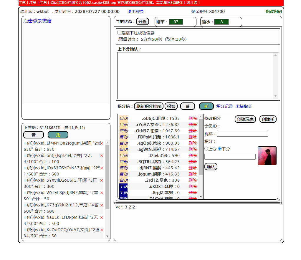 开奖对接的是168,可以正常采集开奖结算,总后台没有开下级代理账户的地方,前端需要在机器人后台创建玩家后复制对应链接才可以进入