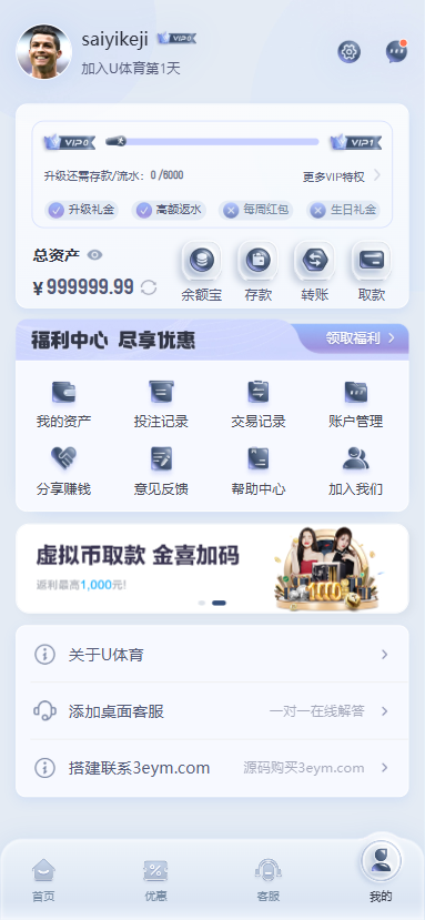 U 体育娱乐城源码是一套面向菠菜综合娱乐平台长期运营设计的运营级系统,源码是前后端分离架构的,前端基于 Vue 框架,后端使用PHP ,系统结构清晰,扩展性强。